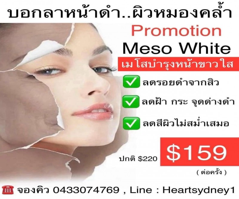 เมโส White หน้าขาวใส $159 จองคิว0433074769 , Line : Heartsydney1