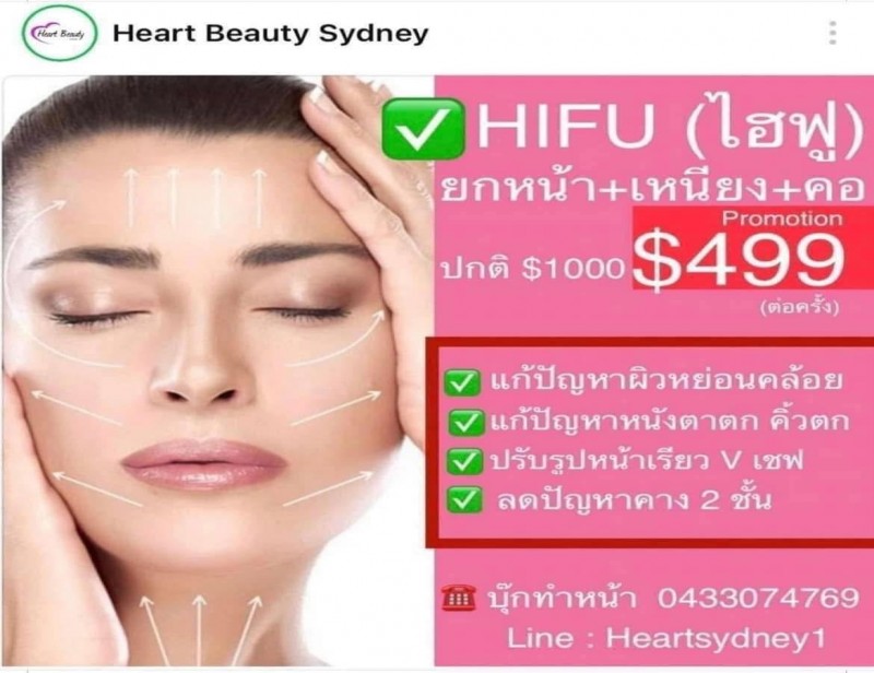 HIFU ยกกระชับ หน้า เเหนียง คอ $499 จองคิว0433074769 Line : Heartsydney1